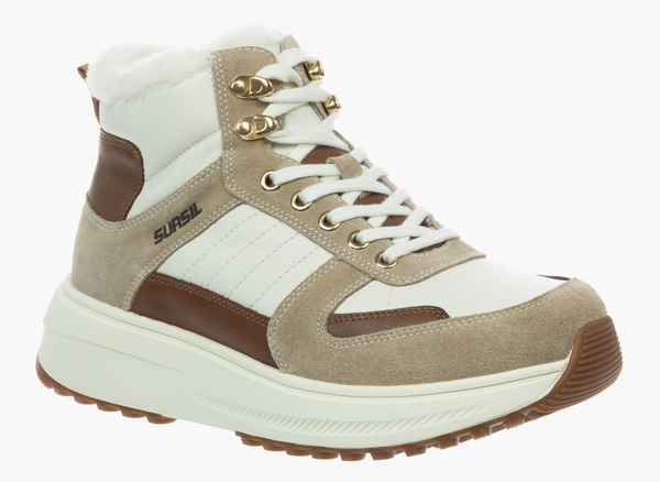 Верх из натуральной кожи белого цвета в сочетании с нубуком светлых и темных оттенков бежевого, дополненный сливочно белой подошвой с каучуковым протектором - образец актуального стиля в сочетании с комфортом. Белая шерстяная подкладка и покрытие стельки обеспечат ногам тепло при минусовых температурах. Застежка на молнии с внутренней стороны в дополнение к шнуровке значительно повышает удобство надевания. Анатомическая стелька с выраженной поддержкой сводов способствует распределению нагрузки на ноги и снижению усталости при ходьбе. Голеностоп надежно удерживается от завала плотным задником. Модель остаточно легкая благодаря подошве из вспененного материала ЭВА, который еще и отлично амортизирует, а противоскользящий протектор обеспечивает устойчивость даже на скользких поверхностях. Подошва имеет перекатный профиль, что значительно снижает усталость при длительной ходьбе.