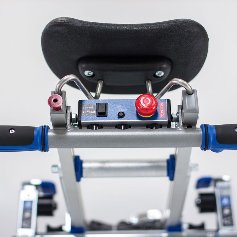 Подъёмник SANO PTR XT 130 – состоит из платформы с закрепленными на ней пандусами и управляющей рукоятки. На управляющей рукоятке присутствуют следующие органы управления: - кнопка, с помощью которой осуществляется перемещение устройства вперед и назад; - аварийная кнопка, блокирующая устройство; - кнопка, с помощью которой осуществляется выбор направления движения устройства; Рукоятка управления оснащена: - регулируемым по высоте подголовником; - перекладиной. Перекладина перемещается вверх и вниз по рукоятке управления (имеет 15 положений, устанавливаемых с помощью фиксирующих головок, расположенных с левой и правой стороны). Перекладина имеет изменяемую ширину, регулируемую с помощью выдвижных держателей, которые фиксируют спинку инвалидной коляски с помощью подвижного элемента с зажимом (по типу струбцины). Минимальное расстояние между держателями 366 мм, максимальное расстояние между держателями 581 мм; - ремнем для фиксации тела человека; - в нижней части рукоятки управления располагаются упоры, для инвалидной коляски; - для удобства управления устройством рукоятка имеет прорезиненные ручки. Управляющая рукоятка подключается к платформе без использования проводов. Платформа оснащена: - двумя гусеничными лентами, позволяющими передвигаться по ступеням; - колесной системой. Колесная система состоит из четырех колес, располагающихся по бокам платформы (два колеса с каждой стороны платформы) - кнопкой, с помощью которой осуществляется перемещение устройства вперед и назад; - кнопкой, с помощью которой осуществляется выбор направления движения устройства; - разъемом для подключения блока питания; - разъемом для установки ключа, приводящего устройство в режим готовности; - светодиодной подсветкой ступеней; - трехпозиционным переключателем скоростей; Во избежание попадания посторонних деталей, движущиеся части, за исключением гусеничных лент и боковых колес, закрыты.